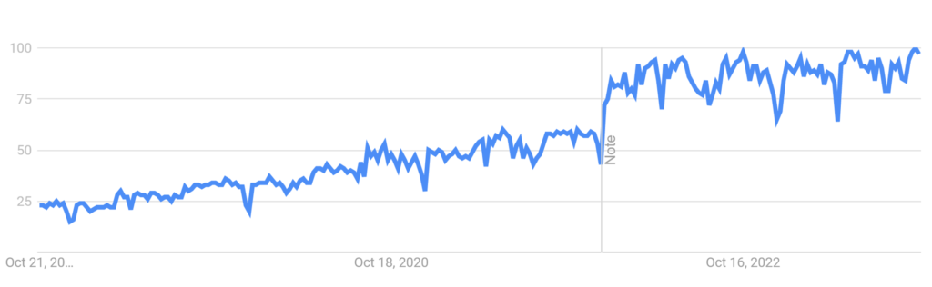 • 2020: A spike in interest due to the COVID-19 pandemic accelerating digital adoption (and improved tracking algorithms).
